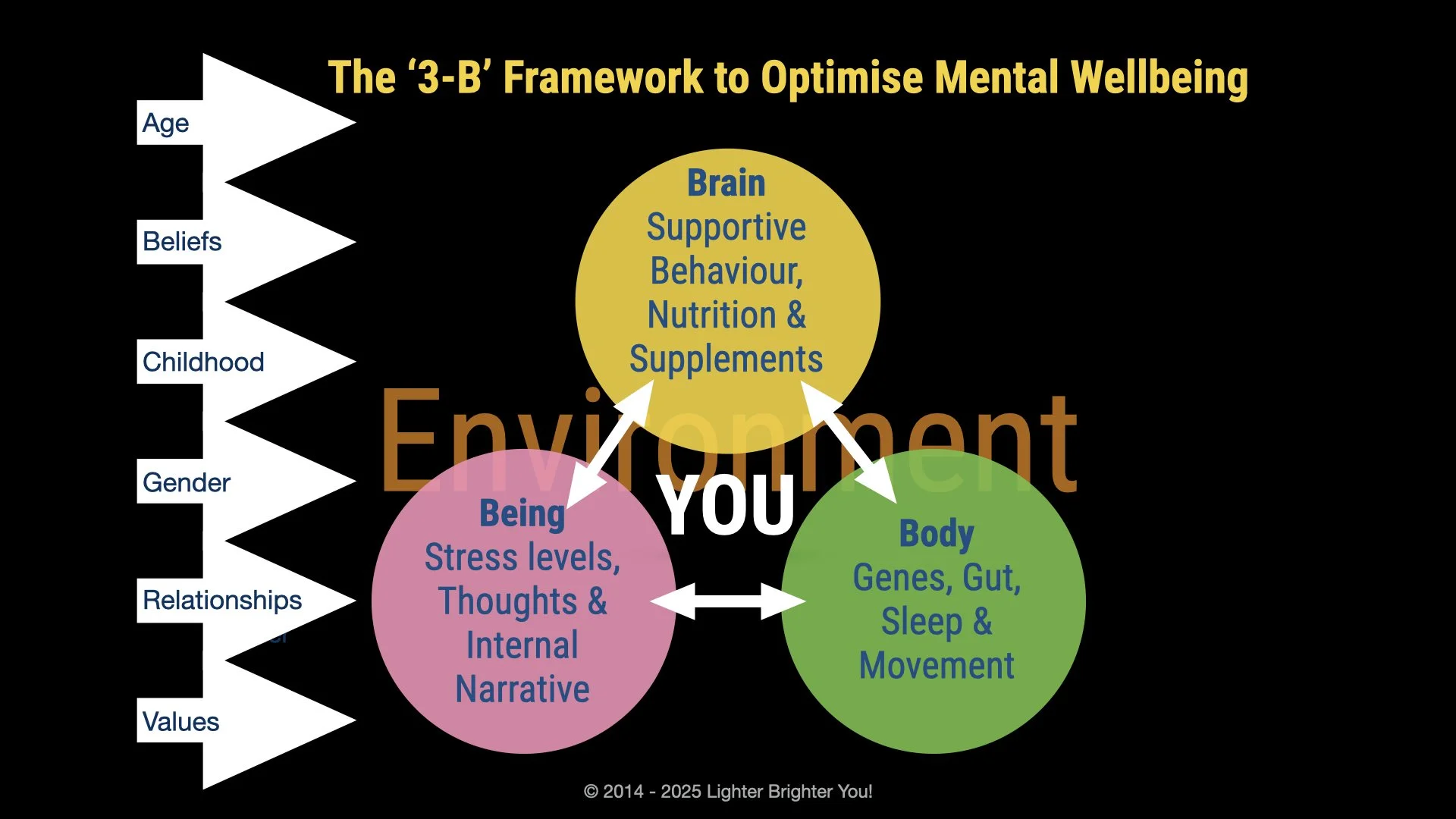 My '3-B Framework’ helps you to support your busy (and often ‘wired but tired’) brain, your (frequently exhausted) body, and transforms how you show up in the world, because often the way we are 'being' contributes to our experiences of distress and disease.